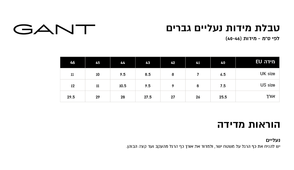 ניתן להחליף פריטים ללא עלות עד 14 ימים מיום קבלת ההזמנה, באריזתם המקורית, עם תווית מצורפת ובתנאי שלא נעשה בהם שימוש בכל אחד מסניפי רשת GANT (למעט סניפי אאוטלט) בהצגת חשבונית המקור אשר התקבלה בהודעת SMS.